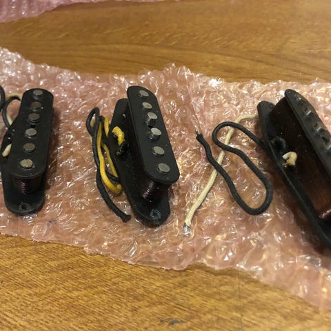 S.S.S. Komplett set fra en 2001 modell Squier Affinity. Pickups, 5 pos. Switch, Tone og Volume potter. Selges Komplett 500kr eller delvis. Pickups 300kr, switch 100kr, Potter 250kr. Eller bud. Knekkt finne på plekterbrett, se bilde nr 3. Priser/bud inkludert frakt. Mvh. Martin