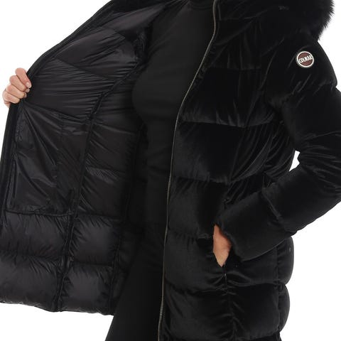 Superfin svart Colmar vinterjakke med falsk pels på hetten, størrelse 44. Jakken er fylt med dun, noe som gir god isolasjon og varme.