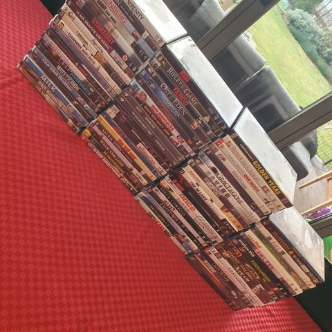 Samling av DVD-filmer med ulike titler og sjangere.