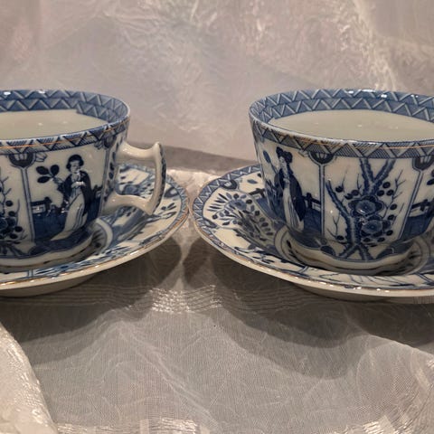 To pene tekopper med tilhørende skåler i klassisk blå/hvit dekor.