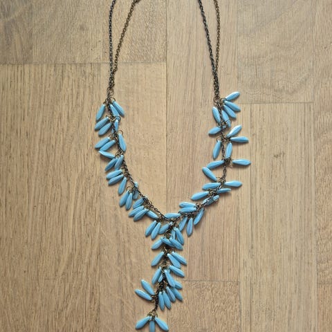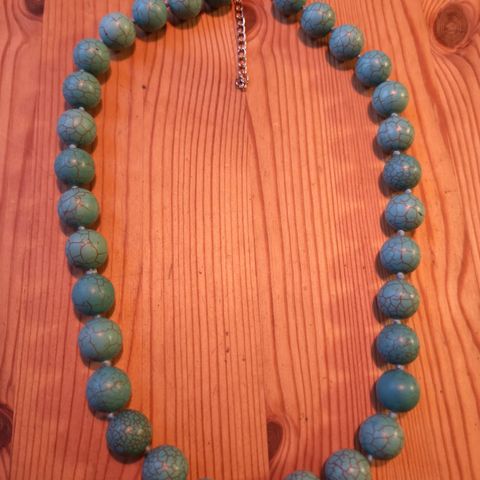 Smykket består av perler i naturlig stein (trolig farget howlitt) i en nydelig turkis tone. Mellom steinene er det lette pynteperler i plast med en flott bronse-finish. Alt er montert på en solid, mørk tekstilsnor.