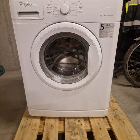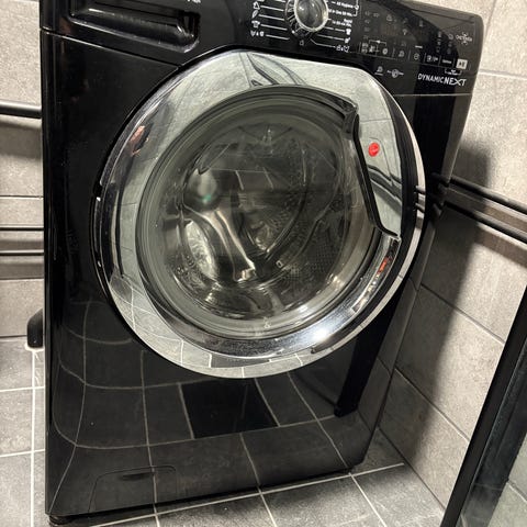 Hoover frontmatet vaskemaskin med frontåpning og kontrollpanel på toppen. Vaskemaskinen har et kompakt design med hvit farge. Den er egnet for husholdningsbruk og har standard funksjoner for klesvask.
