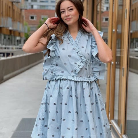 Veer Dress fra Munthe. Kort kjole med subtile striper og monogramprint, detaljert med volanger over skuldrene og midjen, v-hals med rysjekant og skjørt med utsving.