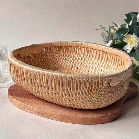 søkeord: interiør dekor dekorasjon decor flettet boho stil kurv, oppbevaringskurv, stråkurv naturmaterialer flettet kurv håndlaget pyntegjenstand vintage pynt, oppbevaring med lokk retro rustikk interiør naturlig brunt brun baderom rustikt syboks syskrin sykurv fruktkurv garnkurv