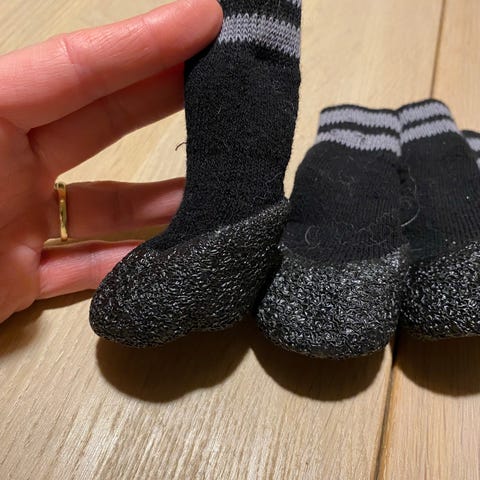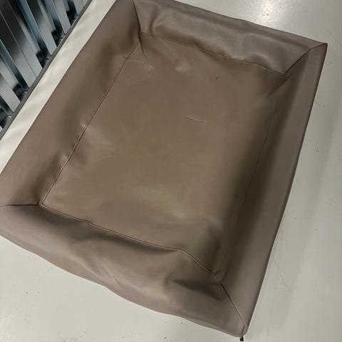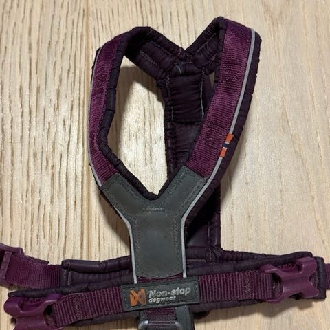Kjøpt ny av meg og brukt i 3 uker, nå er den for liten for valpen. Stoffet på innsiden har fått en bitteliten rift, ingen betydning for bruken.