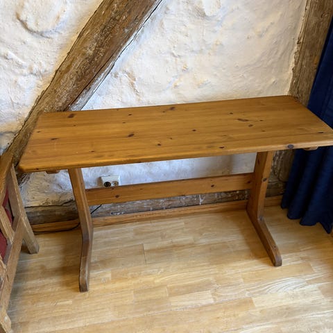 Pent brukt stol i furu og med lyst stoff selges. Stolen er uten flekker/merker.