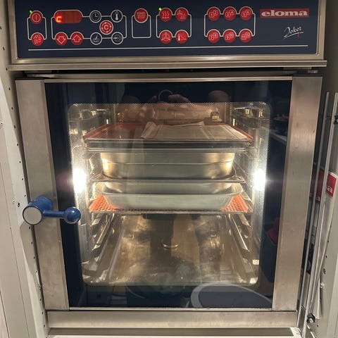 Kjøle benk er rustfritt stål med glasspaneler på flere sider. og visning av matvarer. Utstyrt og hjul for enkel mobilitet. Passer til bruk i kantiner, kebab / pizza i restauranter eller andre serveringssteder.