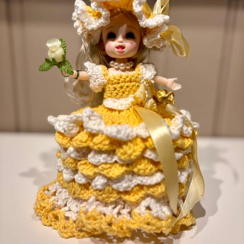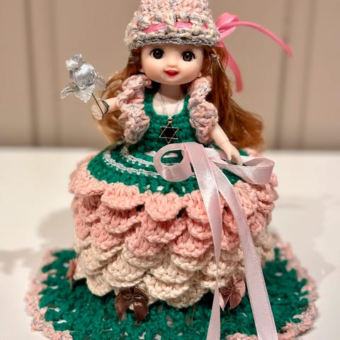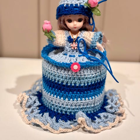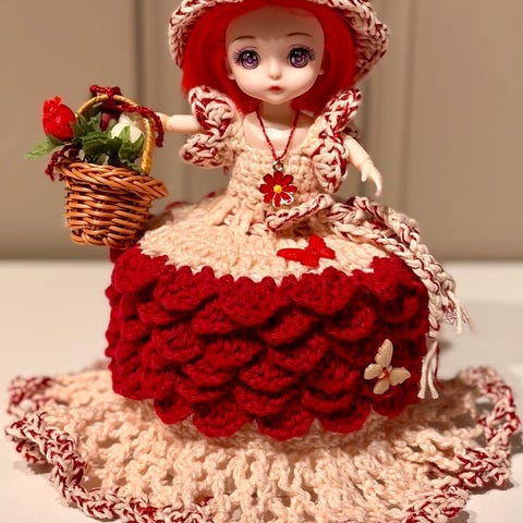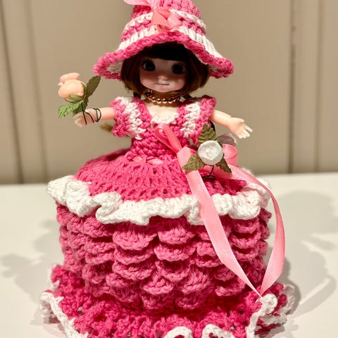 Søkeord: Håndlaget Retro Gammeldags Heklet Hekling Dukke Dokke Dorull Toalett Bad Pynt Håndarbeid Fargerikt Hjemmelaget Kjole Gaver