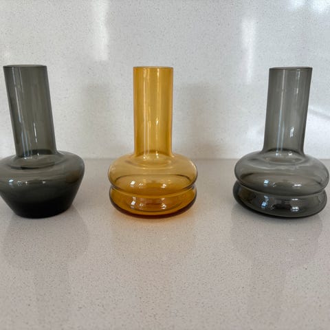 Én stor og én liten blomstervase i gjennomsiktig glass, med diskré motiv av blomster. Ukjent merke.