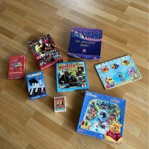 Blandet utvalg av brettspill og kortspill med forskjellige temaer og alderstilpassede innhold. Spillene inkluderer blant annet Elias, Fantorangen, Jolly Octopus, Trafikk Skilt, Mitt Skip er Lastet med, Kardemomme by memo, Dinosaurspill samt flere andre. Spillene er egnet for barn og kan brukes til underholdning og læring.