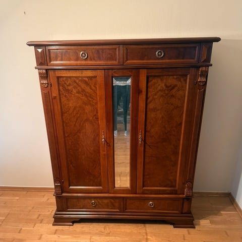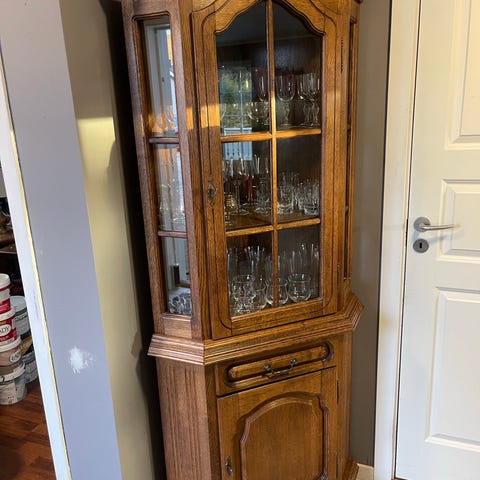 Selger ett pent brukt vitrineskap uten noen synlige merker, i fargen valnøtt