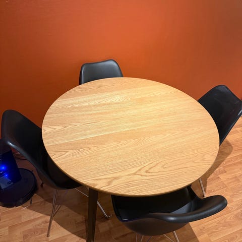 Rundt spisebord med hvit bordplate i MDF og ben i massivt tre. Treet er lakkert for forlenget holdbarhet. Ø105 x H75 cm