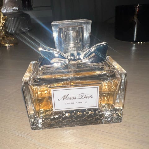 Dior Miss Dior parfyme i en glassflaske med 20 ml innhold. Parfymen har en klar væske og en sølvfarget hette. Passer til bruk som personlig duft.