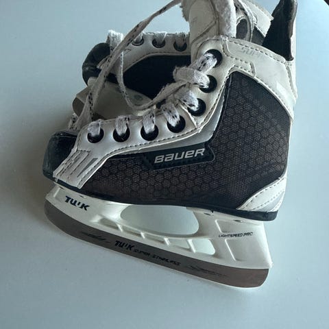 Bauer Ishockeyskøyter for barn i størrelse 28. Skøytene er tilpasset ishockeybruk og har svart og hvit farge.