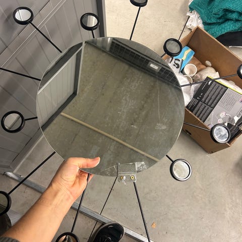 IKEA rundt speil med brun ramme. Speilet har en enkel og rund form med en ramme i brun farge (valnøttfiner), egnet for veggmontering i ulike rom. Medfølger ikke veggfeste og skruer.