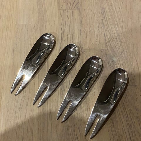 Hardanger bestikk 5 deler, spise skje,2 gafler,Te skje og salat gaffel,se bilder på målene, alle er hel og fin, kan sendes, samlet pris,400 kr