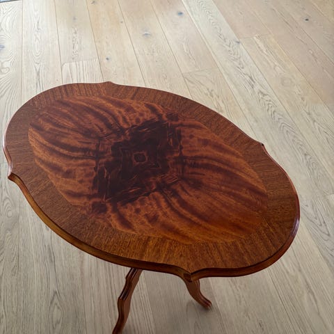 Pent rundt bord selges, plasseringsvennlig. Buede ben for en nostalgisk look, passer både som sofabord og hjørne bord. Høyde 50 cm og bredde 60 cm Noen bruksmerker på bordplaten