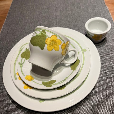 1 stk stor, 2 stk av hver mindre størrelse. 1 stk serveringsfat med inndelinger.
