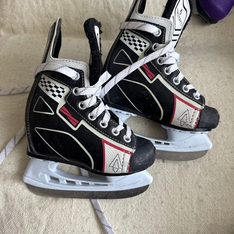 Barneskøyter i størrelse 26 med hvit og lilla farge. Egnet for ishockey.