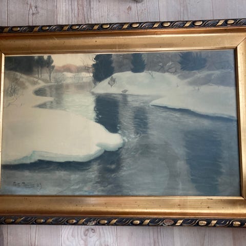 Plakaten ble utgitt i forbindelse med utstillingen «Fritz Thaulow i 1880-årene» og er et offisielt museumstrykk, ikke en senere dekorreproduksjon. Den er pent bevart bak glass i ramme, med klare farger og uten synlige skader.
