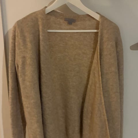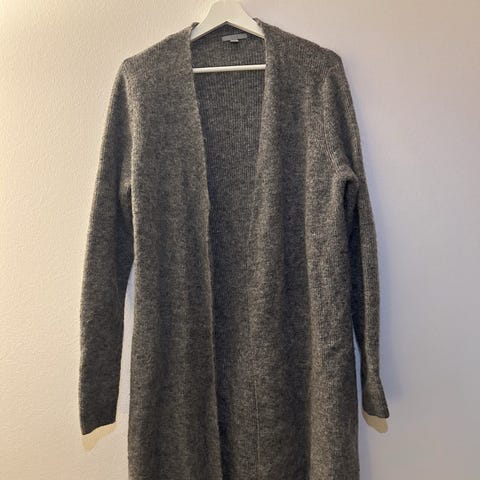 Vid cardigan med ribbestrikket struktur og kimono ermer. 100% bomull. Pent brukt og fri fir feil.