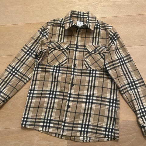 Urban Pioneers skjorte i størrelse M, beige farge, laget av 50% viskose og 50% lin. Kortermet design med knappelukking foran.