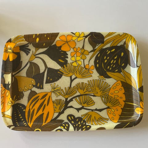 Trolig fra 1960-1970-tallet. Hvitt på baksiden med noen bruksmerker fra kniv, men dette gir brettet autentisk vintage-karakter.