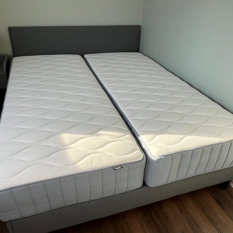 Kjøpt i juli 2025, og kun brukt annenhver uke. Selges pga overgang til mindre seng. Madrasser følger med.