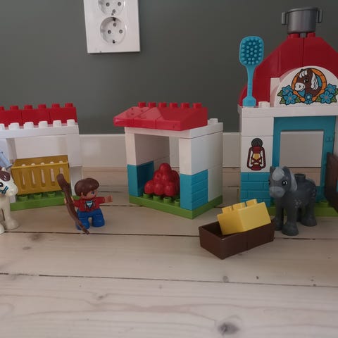 Søt duplo-stall for små heste-elskere. Komplett sett, 65 deler. Pent brukt, bygningsinstruksjoner medfølger ikke.