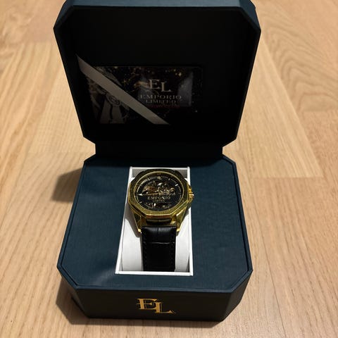 Selger en stilren og klassisk Emporio Limited Milano Automatic herreklokke. Klokken har automatisk urverk (trekkes opp av bevegelse), delvis skeleton-skive og gjennomsiktig baklokk som viser mekanismen.