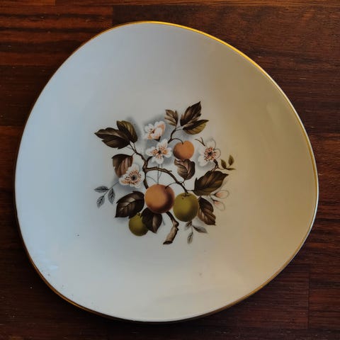 Tallerkenene har en dekorativ spiral og barklignende kantdesign.