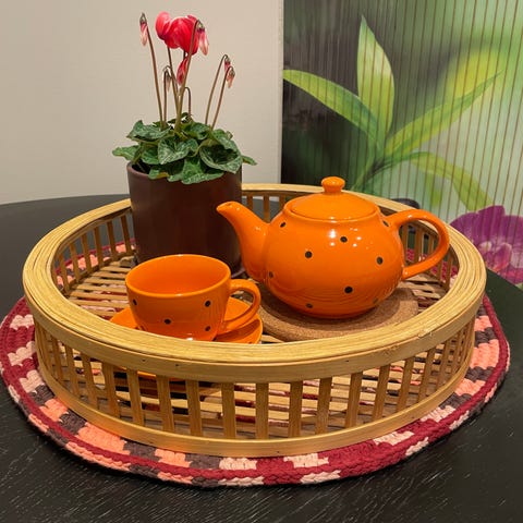 Selger et flott roterende serveringsbrett i bambus med diameter 50 cm. Brettet er kun brukt én gang som ostefat, og fremstår som tilnærmet nytt uten synlige bruksmerker.