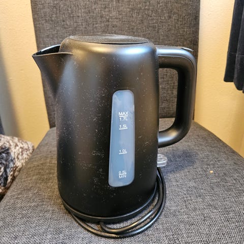 Vannkoker i svart farge. Utstyrt med vannivåindikator og håndtak for enkel bruk. Fungerer som den skal.