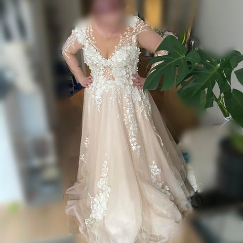 Selger min nydelige, ubrukte brudekjole. Dette var virkelig min drømmekjole, men pga vektnedgang må jeg selge den videre. Så håper noen andre kan få glede av den!