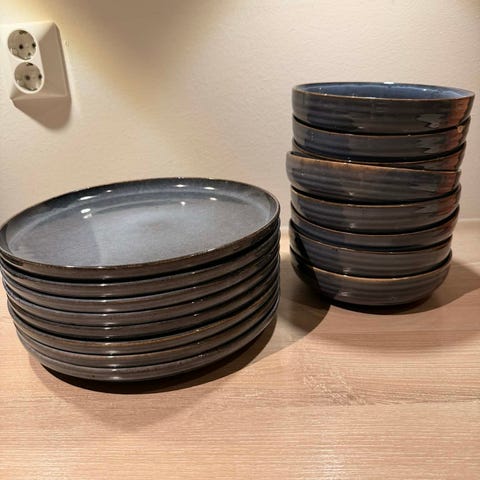Kremmerhuset servise i brun keramikk, bestående av kopper og tallerkener. Serviset har et enkelt og tidløst design, egnet for daglig bruk i kjøkken og spisestue.ubrukt.6kopper,6tallerk 20cm og 6små skåler