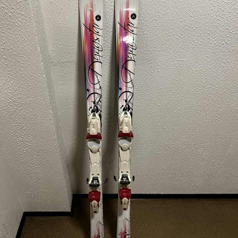 4FRONT Aretha twintip med raus midtbredde på 10 cm. Skiene er brukt i bakke og løssnø av en voksen dame - aldri railet med.. Sålen er innsauset med glider.