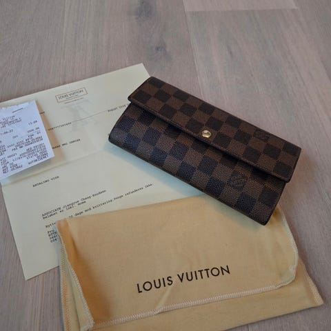 Louis Vuitton lommebok selges. Den har mange lommer og rom for oppbevaring av mynter og kontanter.