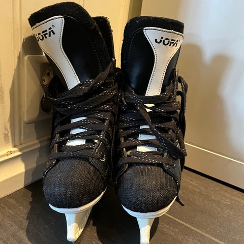 Jofa ishockeyskøyter i størrelse 41, farge svart. Skøytene er beregnet for ishockey og har snøring for justerbar passform.