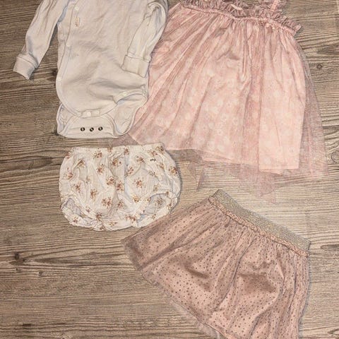 5 søte bodyer, 4 bokser, en kjole, en genser, en cardigan og ett sett av ukjendt merke. Av bodyene og boksene er der to sett også dei med hjerter og bodye med bamse fjes hører til boksa med føter🥰 alt er brukt men i god stand ingen synlige bruksmerker🤍