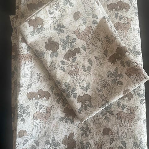 Sovepakke med Lillebjørn thermodyne fiberdyne i størrelse 100 x 140 cm, fiberpute, og to tilhørende sengesett. Det blå med tog er i krepp, det grønne i rett bomull. Alt er pent brukt, nyvasket og klart for ny eier.
