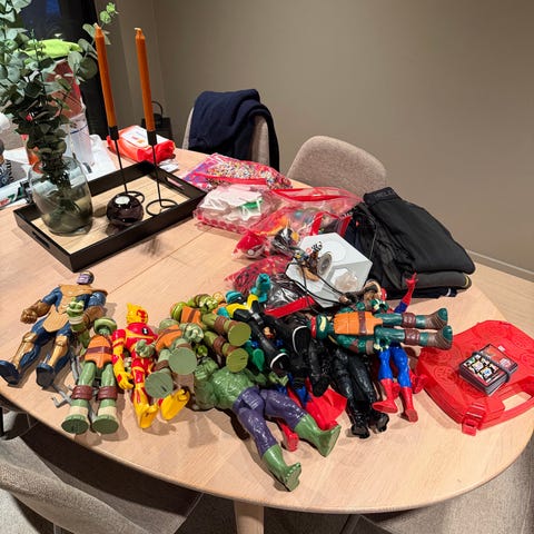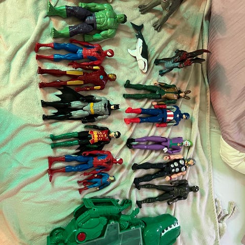 Marvel actionfigurer inkludert Iron Man, Spider-Man, Captain America, Hulk og flere, i ulike størrelser og farger. Settet inneholder også en svart motocross sykkel. Figurenes materiale og eksakte størrelse er ikke oppgitt. Passer til lek og samling.