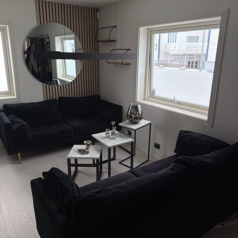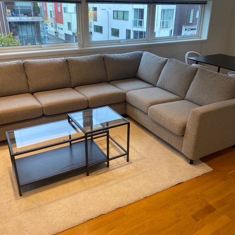 Sofa, bord og teppe