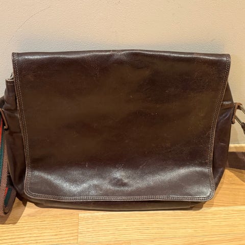 Brun veske i kunstlær med krokodilletrykk. Uttagbar innvendig organisator medfølger. Vesken har både et topphåndtak og en avtagbar stropp som kan brukes på tvers av kroppen. Vesken er pent brukt og den har ingen bruksmerker. Målene på vesken 34x24x13 cm
