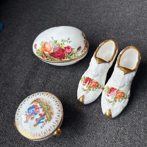 Royal Albert Old Country Roses kaffekanne med tilhørende kremkanne og sukkerskål. Serviset har et blomsterdekor med røde, rosa og gule roser på hvit porselensbakgrunn med gullkant. Passer til servering av kaffe og tilbehør.