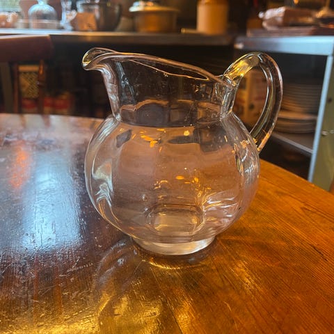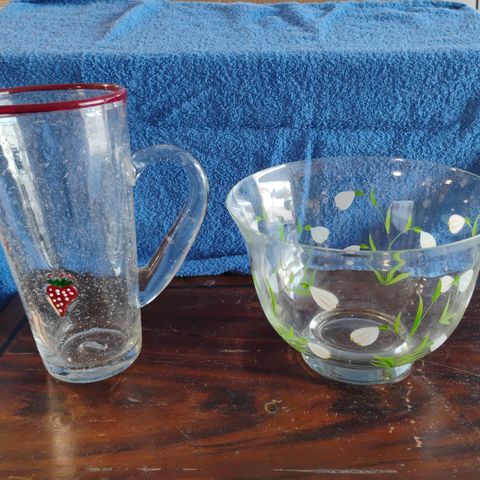 Stilig liten mugge i sjøgrønt / blågrønt glass med metall ring rundt som metall hanken er festet i.