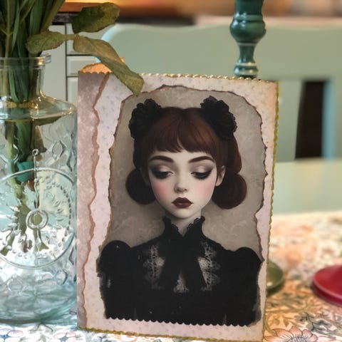 Dette kortet er dekorert med papir, perler, fjær og silke’bånd.🖤🤩