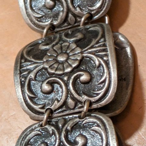 Selger et nydelig statement-armbånd i antikksølv-finish med detaljrike blomster- og etno-motiver. Armbåndet er solid og har et flott rustikt preg.