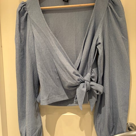Monki topp i størrelse S, farge lys blå, laget av polyester. Toppen har lange ermer og en knyting i midjen.