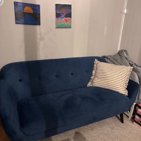 Sofaen er hel, stabil og pen i stoffet, uten rifter eller skader. Røyk- og dyrefritt hjem.