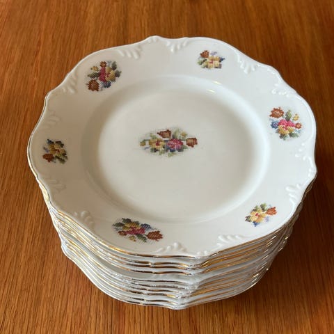 Seks dessertskåler fra Johnson Bros, Ancient Towers. Ironstone. Det er gått av et skår under kanten på den ene skålen. Ikke synlig fra oversiden. Se bilde. Selges samlet for 500 kr. Sendes mot tillegg for porto. Forhåndsbetaling med vipps. Bruker ikke Fiks ferdig.